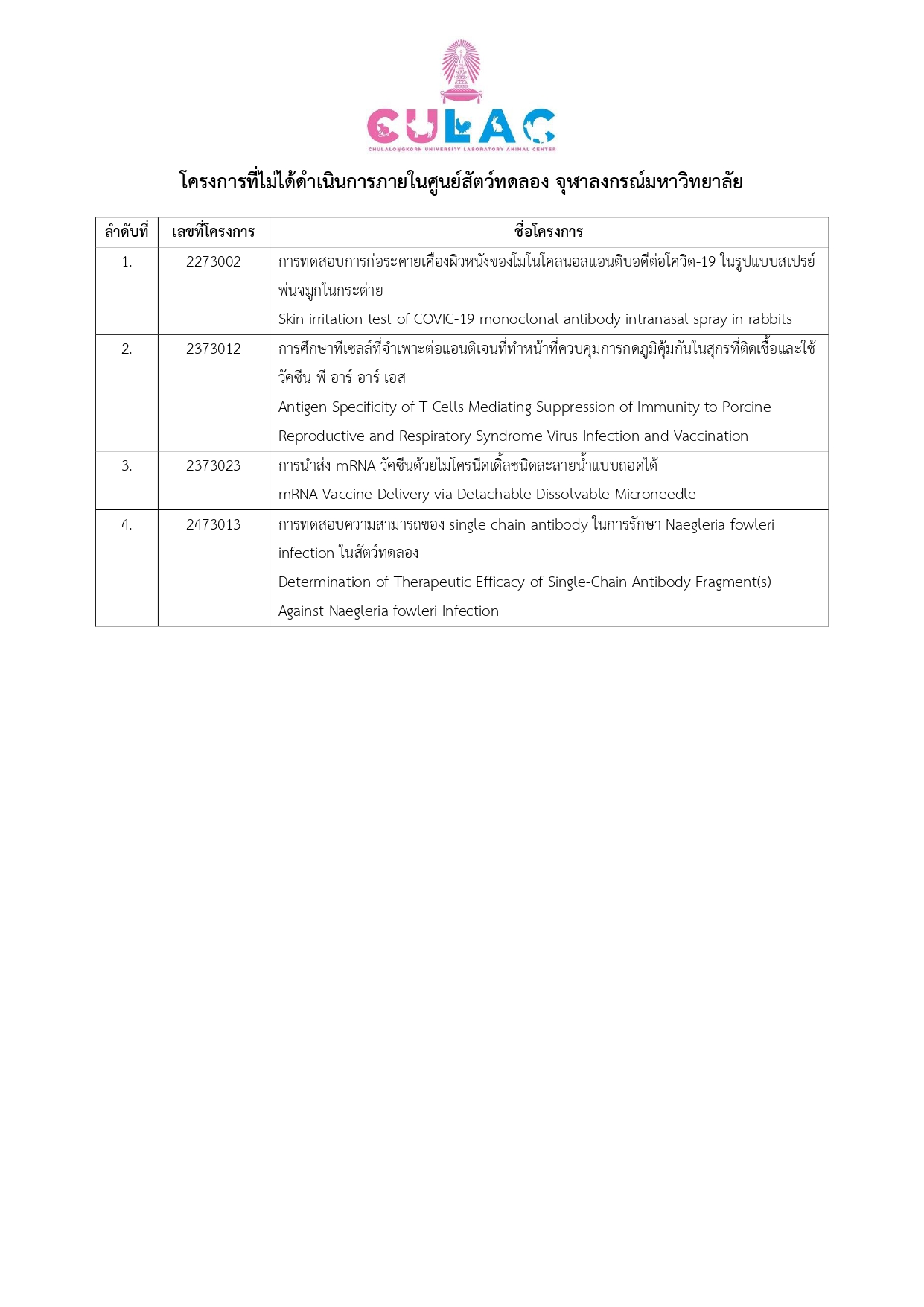 โครงการที่ไม่ได้ดำเนินการภายในศูนย์สัตว์ทดลอง จุฬาลงกรณ์มหาวิทยาลัย